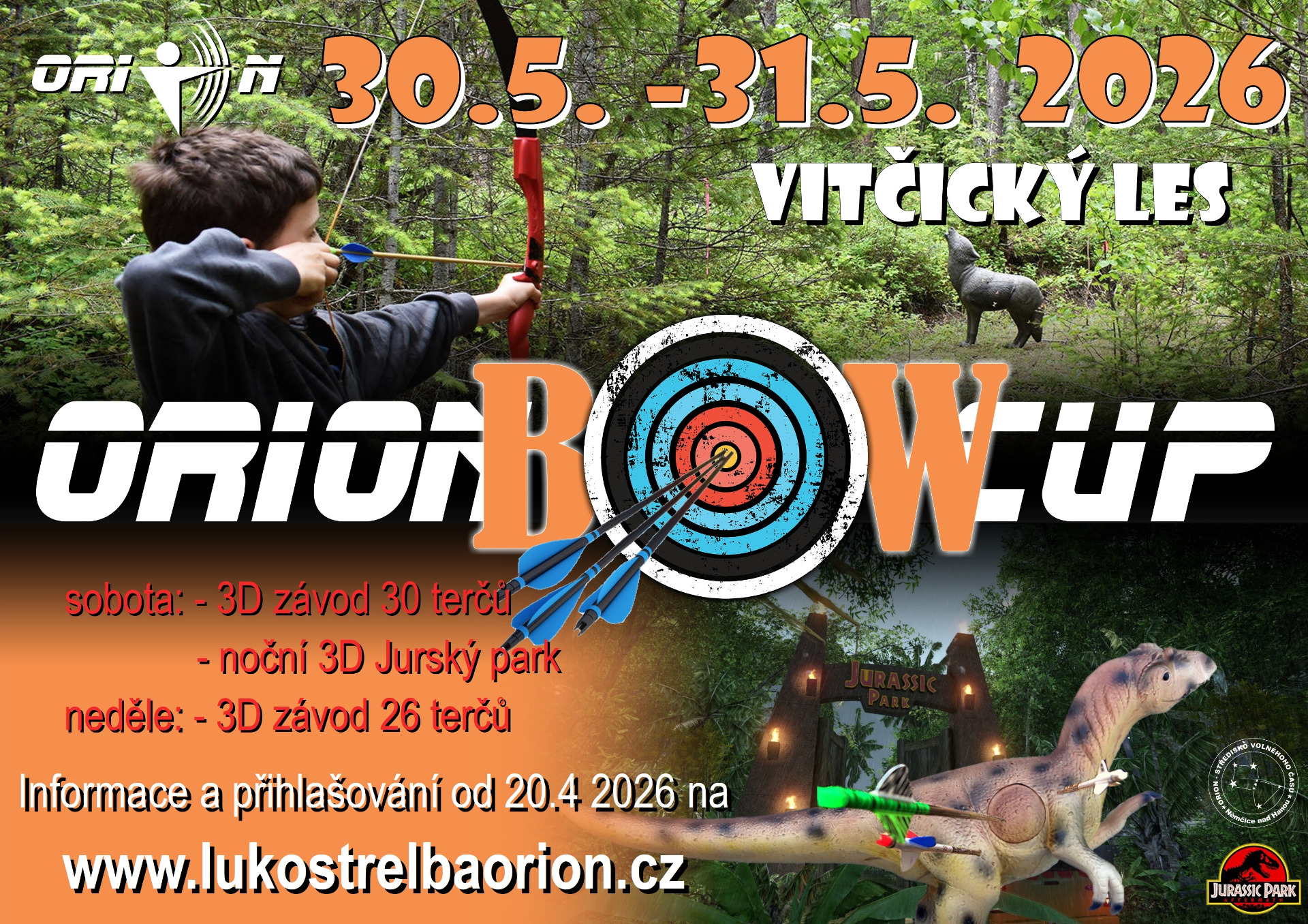 O víkendu 30.-31.5. 2026 chystá LK Orion tradiční velký dvojdenní závad. Skládat se bude ze tří jednotlivých závodů - z toho jeden noční Jurský park. Kapacita střelců max 120. Bližší informace v sekci Orion Bow Cup. Přihlašování bude spuštěno 20. 5. 2026